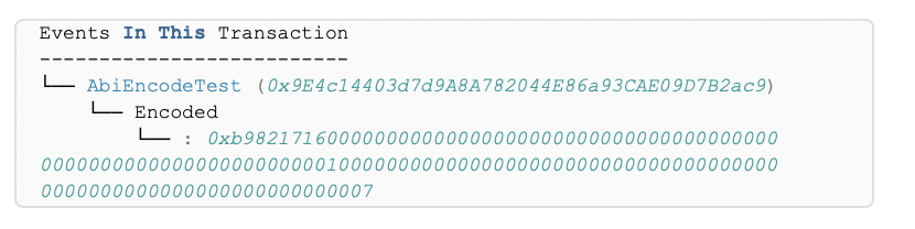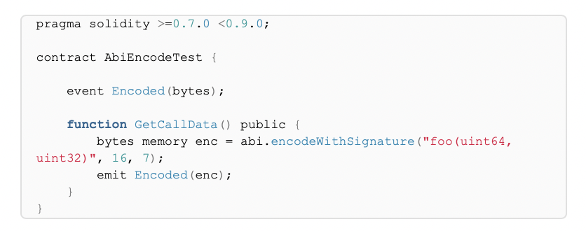 我们可以通过以下的简短合约确认这一点,该合约使用abi.encodeWithSignature方法根据foo()函数签名及其参数生成函数选择器。然后,它将结果(enc)在名为Encoded的事件中发出。事件是一种在事务日志中包含其他详细信息的方法,对于将特定事件细化地提交到链上非常有用: