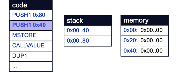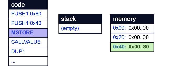 然后通过MSTORE操作初始化自由内存指针,将值0x80存储在内存位置0x40处。
