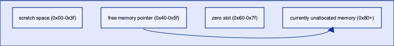 - 字节0x40-0x5f:为32字节的“free memory pointer”保留的空间。这用作指向未分配内存的指针,供合约执行期间使用。